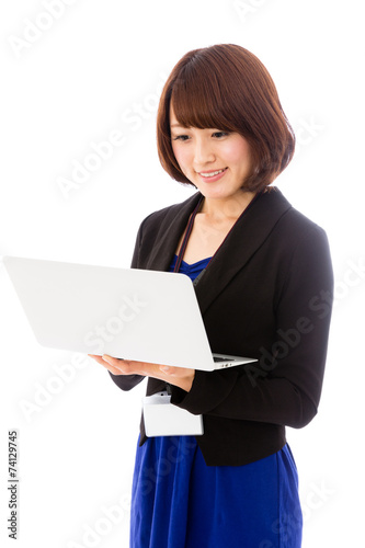 woman, people, ol, smile, personal computer, notebook, cyberspace, mobile, communication, business, career woman, jacket, 30s, young, clean, appealing, clean, alone, working girl, work, suit, stand, bob, crop, cut-out, background, portrait, light, beauty, japanese, asian, chinese, advertisement, copy space