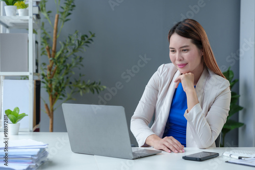 Asian businesswoman sitting in office stressed and fatigued from overwork on financial matters on office desk.