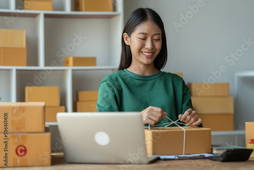 Asian businesswomen tie boxes with ropes in preparation for delivery to customers. Young Asian small business owners use computers. Shipping boxes online market SME e-commerce telemarketing concept.