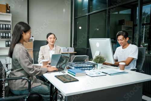 Asian colleagues meet at a desk, discussing business financial terms, investment strategies, managing funds. Their focus is on planning, analysis, and operations to ensure stability and success.