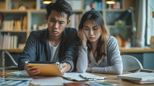Asian couple at home, stressed and worried about past due bills and financial crisis