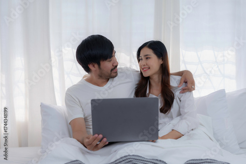 Asian couple smiling and looking at each other while relaxing in bed, using a laptop, representing connection and togetherness