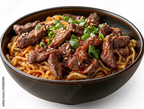 Asian Cuisine Noodles. Stir-Fry Beef with Green Onions and Sesame Seeds in a Black Bowl
