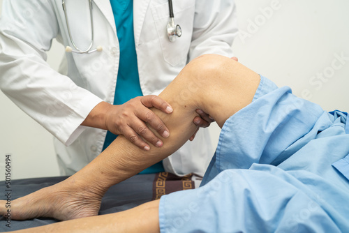 Asian doctor physiotherapist examining, massaging and treatment knee and leg of senior patient in orthopedist medical clinic nurse hospital.