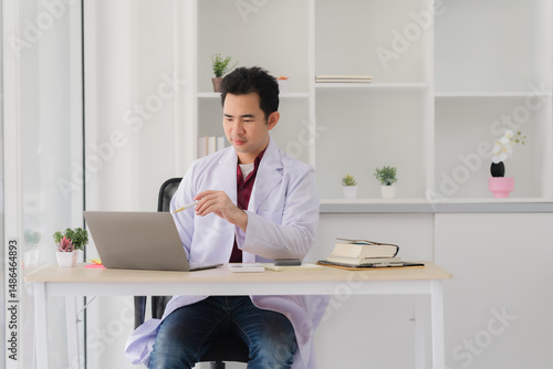 medical professional, doctor, man, laptop, desk, white coat, medicals, medicine, physician, professional, health care, technology, working, office, indoor, male, adult, computer, occupation, job, workplace, consulting, expertise, confident, serious, thoughtful, focused, concentration, interior, bookshelf, plant, notebook, pen, notepad, table, chair, light, bright, modern, contemporary, clean, minimalist, workspace, studying, learning