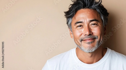 asian, elderly, man, gently, using, eye, cream, looking, camera, relaxed, smile, isolated, beige, background, stock, photo, side, copy, space