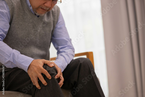 Asian Elderly man with a leg pain sitting on a bed in morning