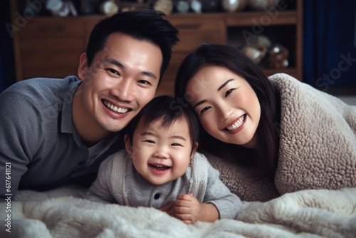 Asian family lying on mat with smiling faces Looking at the camera showing beautiful white teeth