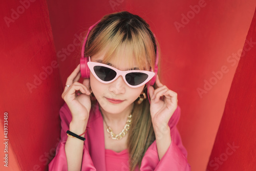 Asian fashion woman with sunglasses and earphones