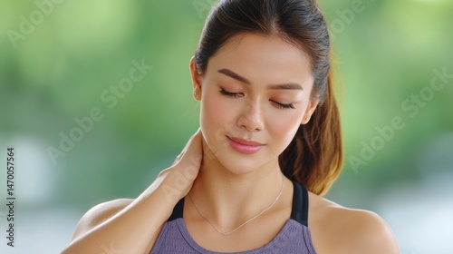 Asian Female Athlete Massaging Her Neck in Outdoor Setting with Relaxed Expression and Serene Green Background