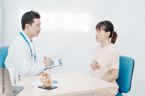 Asian female doctor listens to belly of pregnant mother during a prenatal exam in clinic. doctor provides caring advice, ensuring the health and happiness of the expecting mother and baby.