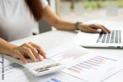 Asian female finance staff is pressing a calculator to calculate company sales and profit to report her boss, profit calculation idea. And the company's performance