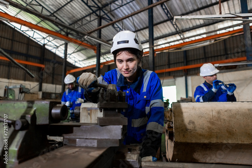Asian female workers wearing uniform safety and hardhat working an iron cutting machine in factory Industrial. Engineering worker man work machine lathe metal. Heavy industry concept.