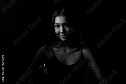 fashion, asian, korean, colours, adult, people, woman, beauty, black hair, face, eye, lip, portrait, sensual, skin, lifestyle, studio, 20s, asian woman, happy, half body, fashionable, pose, lighting, attractive, professional, express, feeling, emotion, advertisement, model, strong, black background, straight hair, goggles
