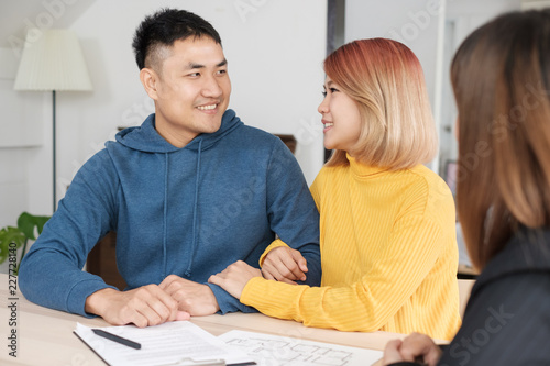 Asian happy couple buying new home with realtor agent with smiling face at new home.buying new house real estate.