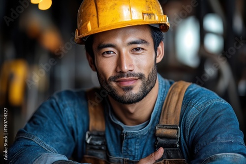 Asian installer giving thumbs up, wearing a helmet and overalls, perfect for industrial branding.