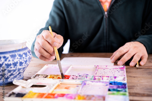 Asian male artist paints with a paint brush and watercolor palette