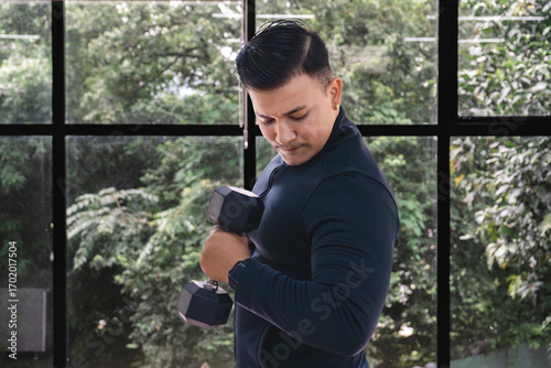 Asian male exercising in a modern fitness center with dumbbells and a running machine.