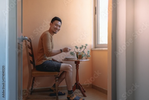 young adult, lifestyle, one person, enjoyment, indoor, time, apartment, smile, alone, window, ravenous, happiness, healthy lifestyle, male, person, sitting, holiday maker, chinese, single, face, happy, early, man, morning, home, appetence, solo, holding, adult, hand, beard, soup, hostel, food and drink, meal, domestic life, eating, cup, lunch, eat, tea, thai, travel, asian, food, hot drink, table, asia, breakfast, guesthouse