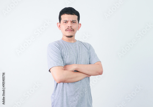 Asian man in grey shirt seriously thinking, Asian man crossed arm.