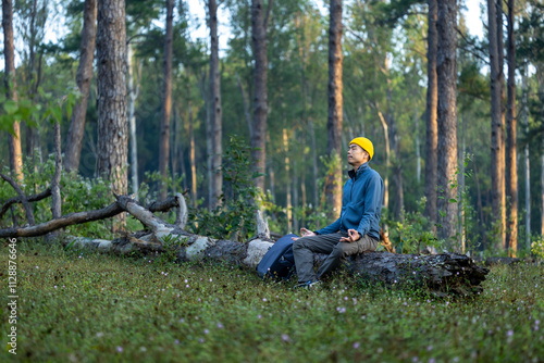 Asian man is relaxingly practicing meditation in pine forest to attain happiness from inner peace wisdom with ray of sun light for healthy mind and soul for healthy mind and soul