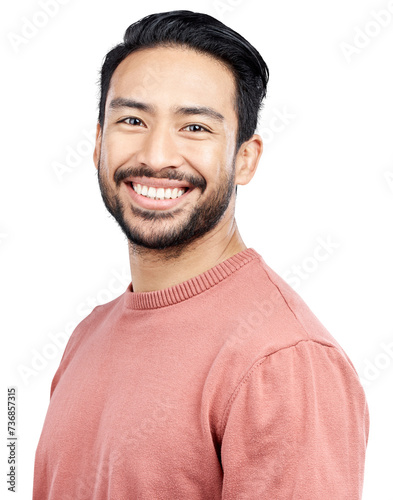 Asian man, portrait and smile with fashion confidence in Singapore for good mood, positive or handsome. Male person, face and isolated transparent png background for relaxing, weekend or carefree