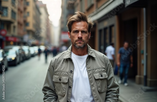 Asian man serious face urban street. City guy 30s walks alone. Unhappy expression. Regular person daily life. Casual clothing. Modern city background.