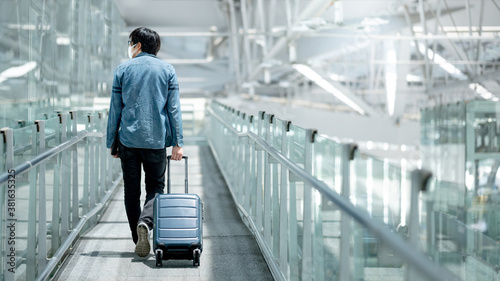 Asian man tourist wearing face mask carrying suitcase luggage walking in airport terminal gate hall. Coronavirus (COVID-19) pandemic prevention when travel. Health awareness and social distancing