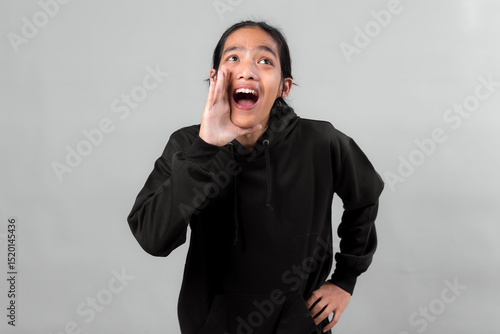 asian, man, shout, shouting, yelling, excited, happy, smile, communication, expression, energetic, loud, casual clothes, portrait, studio, grey background, joyful, youth, male, young adult, enthusiasm, calling, talking, gesture, cheerful, lifestyle, emotion, speaking, announcement, hoodie, casual attire, model, person, fashion, vibrant, isolated, expressive, enthusiastic, studio shot, marketing, outgoing, facial expression, confident, friendly