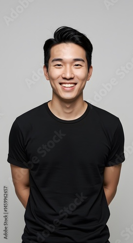 asian, man, t-shirt, black, young, editable, blank, studio, smile, confident, male, front, vertical, portrait, casual attire, clean, fashion, relaxed, modern, diversity, realistic, clothes, minimalist, neutral, background, isolated, real, representation, trendy, photogenic, expression, eye, casual clothes, inclusive, people, pose, minimal, body, shirt