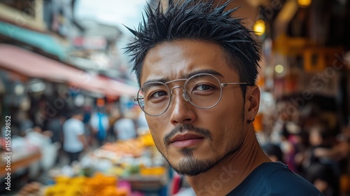 Asian man with aviator glasses gazes sideways at a vibrant marketplace