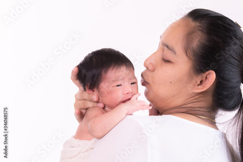 Asian newborn baby crying, hungry, sick on mother arm, Asian beautiful young mother hold infant worry her baby sickness, motherhood multi tasking at home