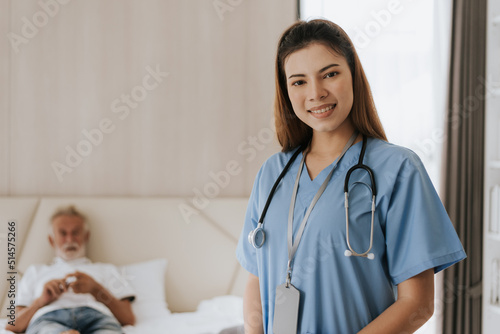 Asian nurse standing and smiling to caring elderly man at home. young nurse helping senior man at home. Senior health care.