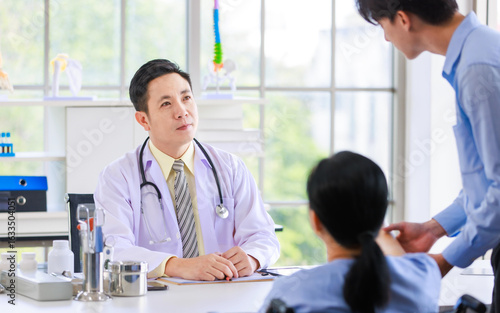 Asian professional doctor consulting senior old female patient with caregiver beside in bright medical office checkup insurance attentively reviews health details providing care support examination