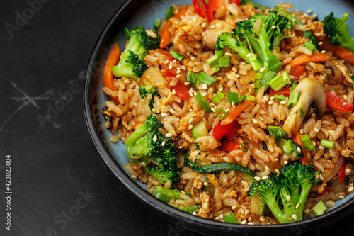 Asian rice with vegetables: zucchini, broccoli, red bel pepper, mushrooms, carrot, spring onion and sesame seeds. Dish isolated in a blue bowl, close-up on a black marble background. Asian cuisine.