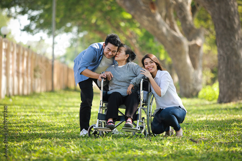 Asian senior woman sitting on the wheelchair with family happy smile face on the green park