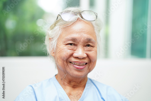 Asian senior woman wearing eyeglasses or vision glasses at home care service.