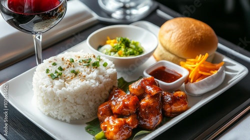 food, aeroplane, flight, meal, plane, airline, air, cabin, alcohol, aircraft, economy, transport, service, travel, wine, table, white, meat, rice, healthy, plate, set, dessert, dinner, cookery, lunch, dish, bun, catering, tray, fly, journey, asian cuisine, eat, fresh, inflight, portion, tasty