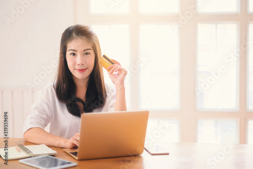 Asian smiling woman holding credit card and using laptop computer to shopping online.