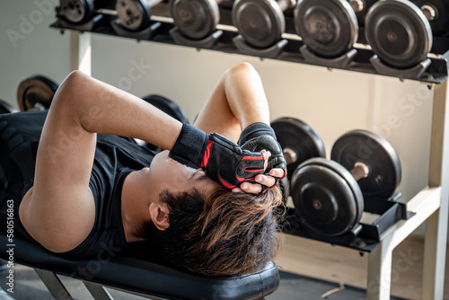 Asian Sport man with well trained body in black sportswear lying on workout bench preparing to do sit-up in fitness gym, warming up before weight training. Bodybuilding concept.