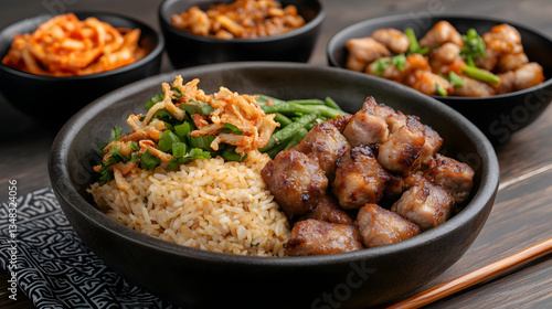 rice, pork meat, bowl, asian, food, grilled, vegetable, dinner, lunch, meal, healthy, delicious, tasty, protein, carb, vegan, vegetarian, chef, eatery, homemade, easy, quick, receipe, cookery, korean, japanese, chinese, food photography, serving, plate, ingredient, comfort food, healthy eating, brown rice, green beans, kimchi, spicey, crispy, flavorful