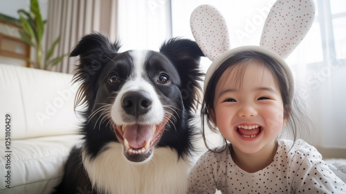 Asian toddler girl wearing polka-dot bunny ears smiling with border collie at home. Concept of festive Easter joy, childhood bonding, and pet companionship.