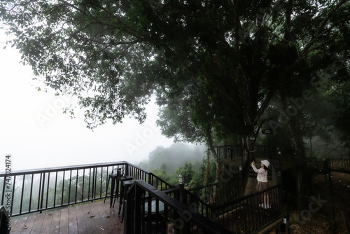 Asian Tourist women On the wooden walkway with Foggy forest Beautiful landscape Scenic view of misty mountain nature background. in Chiang Mai, Thailand