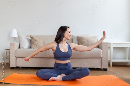 Asian woman exercising at home, stretching. Time for yoga. Attractive and healthy young woman doing exercises while resting at home. Young woman exercising at home, interior