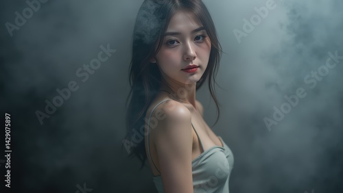 Asian Woman in Smoky Atmosphere: Moody Portrait with Ethereal Lighting and Delicate Features