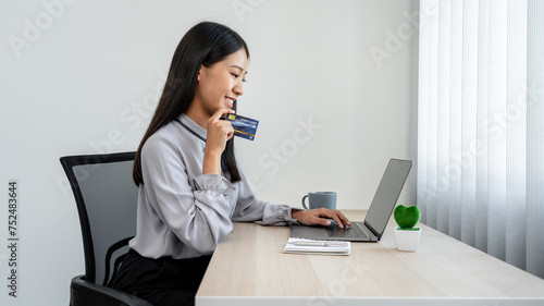Asian woman is showing credit card and using laptop for online shopping to purchasing product on website