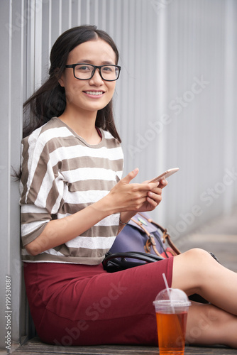 portrait, woman, female, young, pretty, beautiful, asian, eyeglass, casual attire, lifestyle, student, college, university, outdoors, wooden, floor, sitting, looking, posing, smiling, using, smart, mobile, phone, browsing, surfing, cyberspace, plastic, cup, iced, tea, break, manager, businesswoman, designer