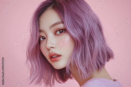 Asian woman, purple bob, pink backdrop, studio portrait, beauty