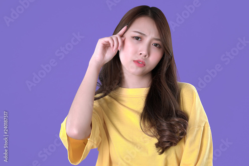 Asian woman thinking to fix problem, yellow t-shirt clothing, purple background