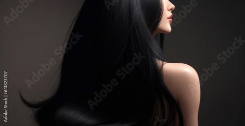 Asian woman with healthy shiny black hair with studio backdrop Lap space for advertising media.Generative AI